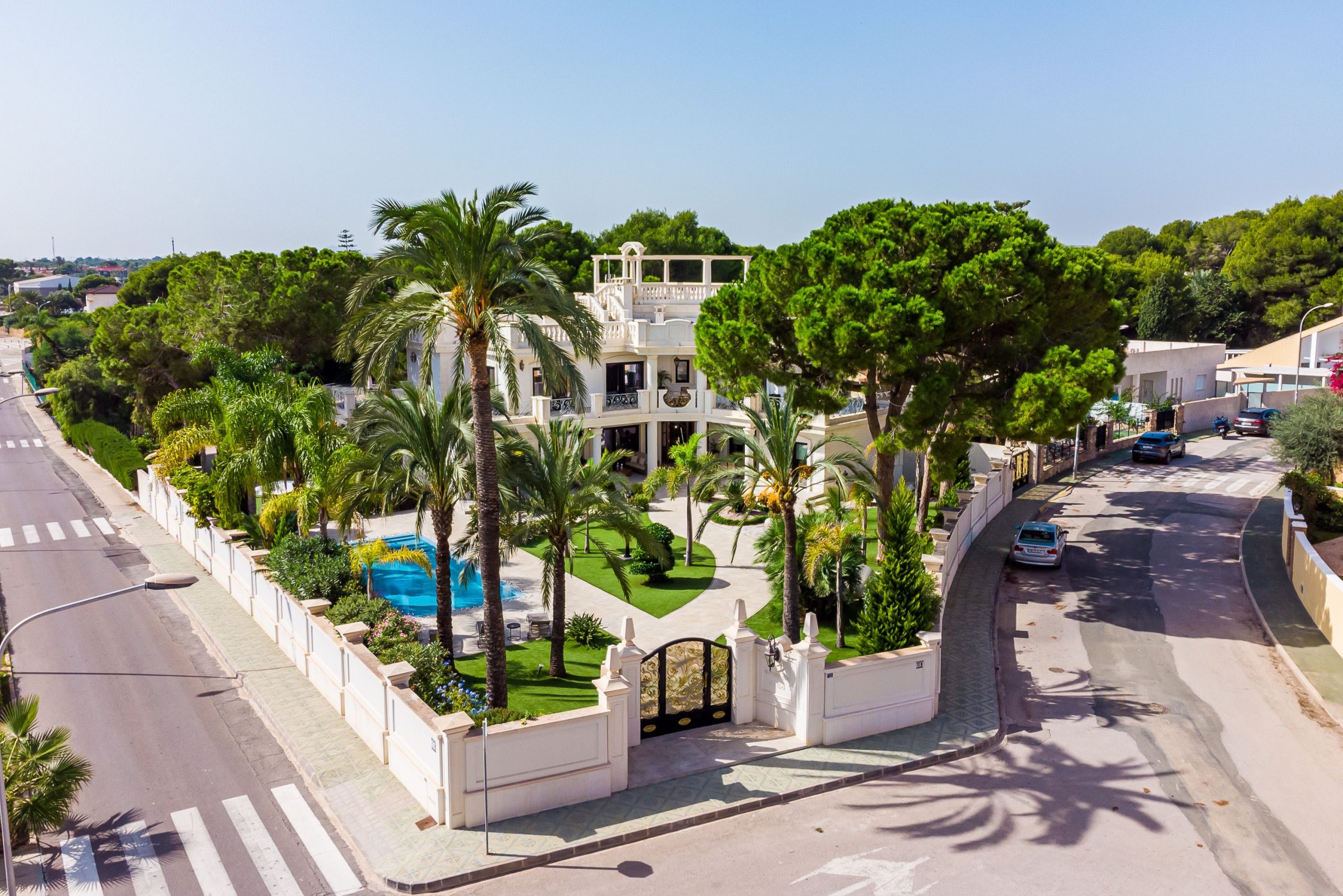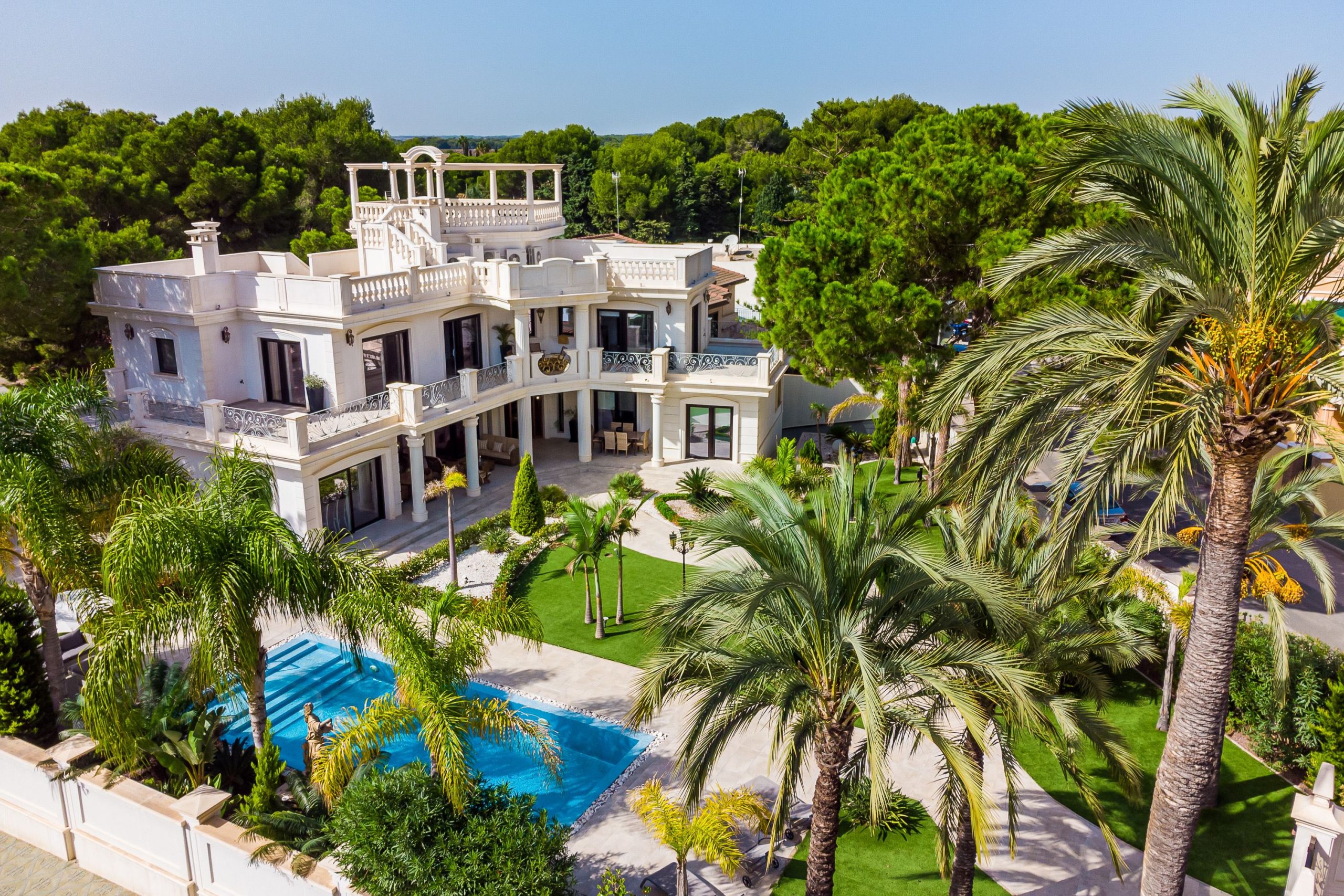 The villa has 700m2 built on a 1,200m2 plot with 5 bedrooms, 6 bathrooms, a spacious and bright living room with large windows overlooking the garden, two fully equipped kitchens, laundry room, elevator, dressing room, first floor terrace and solarium with observer.